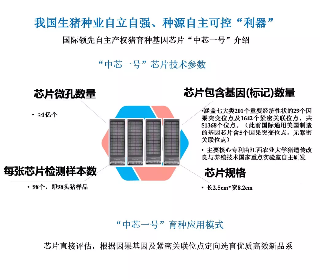 生豬種業(yè)作為產(chǎn)業(yè)鏈“芯片”,是我國種業(yè)主要卡脖子產(chǎn)品?;蛐酒N因其準(zhǔn)確性高而成為國際主流技術(shù)。江西農(nóng)業(yè)大學(xué)研究人員專心致志30多年,研發(fā)了育種性能全面超過美國的家豬新品種培育基因芯片——“中芯一號”,成為國際領(lǐng)先水平的基因育種主導(dǎo)技術(shù)。