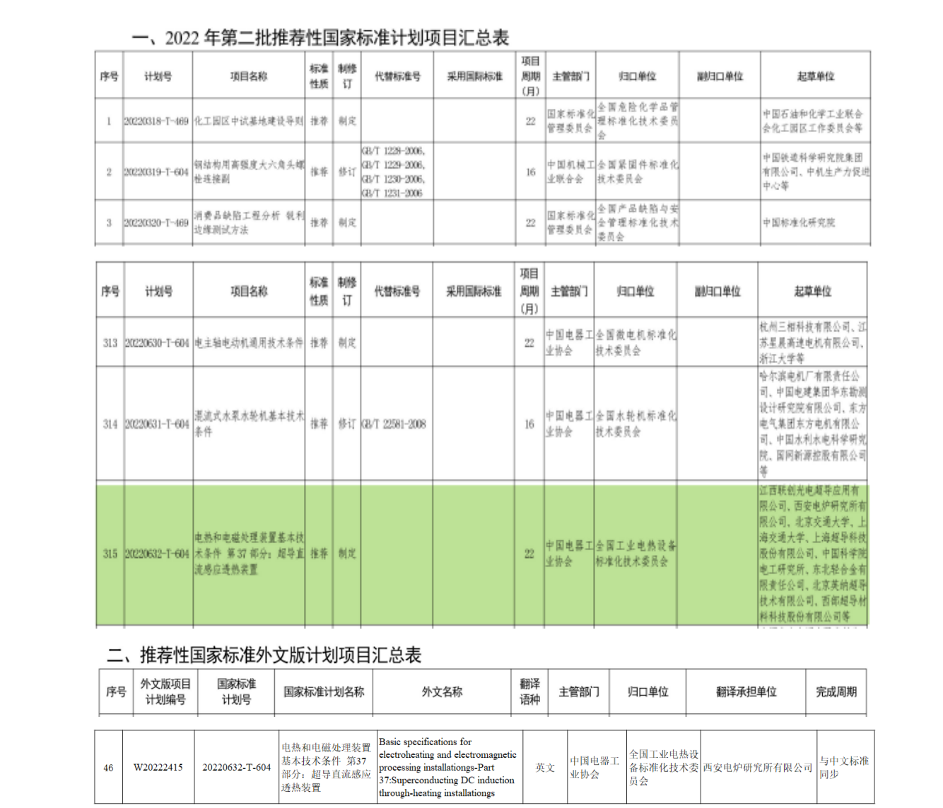 近日,國(guó)家標(biāo)準(zhǔn)化管理委員會(huì)(以下簡(jiǎn)稱(chēng)“國(guó)標(biāo)委”)發(fā)文下達(dá)2022年第二批推薦性國(guó)家標(biāo)準(zhǔn)計(jì)劃及相關(guān)標(biāo)準(zhǔn)外文版計(jì)劃,我集團(tuán)旗下子公司-江西聯(lián)創(chuàng)光電超導(dǎo)應(yīng)用有限公司(以下簡(jiǎn)稱(chēng)“聯(lián)創(chuàng)超導(dǎo)”)作為目前全球首家兆瓦級(jí)超導(dǎo)感應(yīng)加熱裝置的生產(chǎn)單位,牽頭申報(bào)的《超導(dǎo)直流感應(yīng)透熱裝置》推薦性國(guó)家技術(shù)標(biāo)準(zhǔn),獲批立項(xiàng),正式進(jìn)入標(biāo)準(zhǔn)草案起草階段,其作為全球領(lǐng)先的技術(shù),將同步翻譯英文版標(biāo)準(zhǔn)。