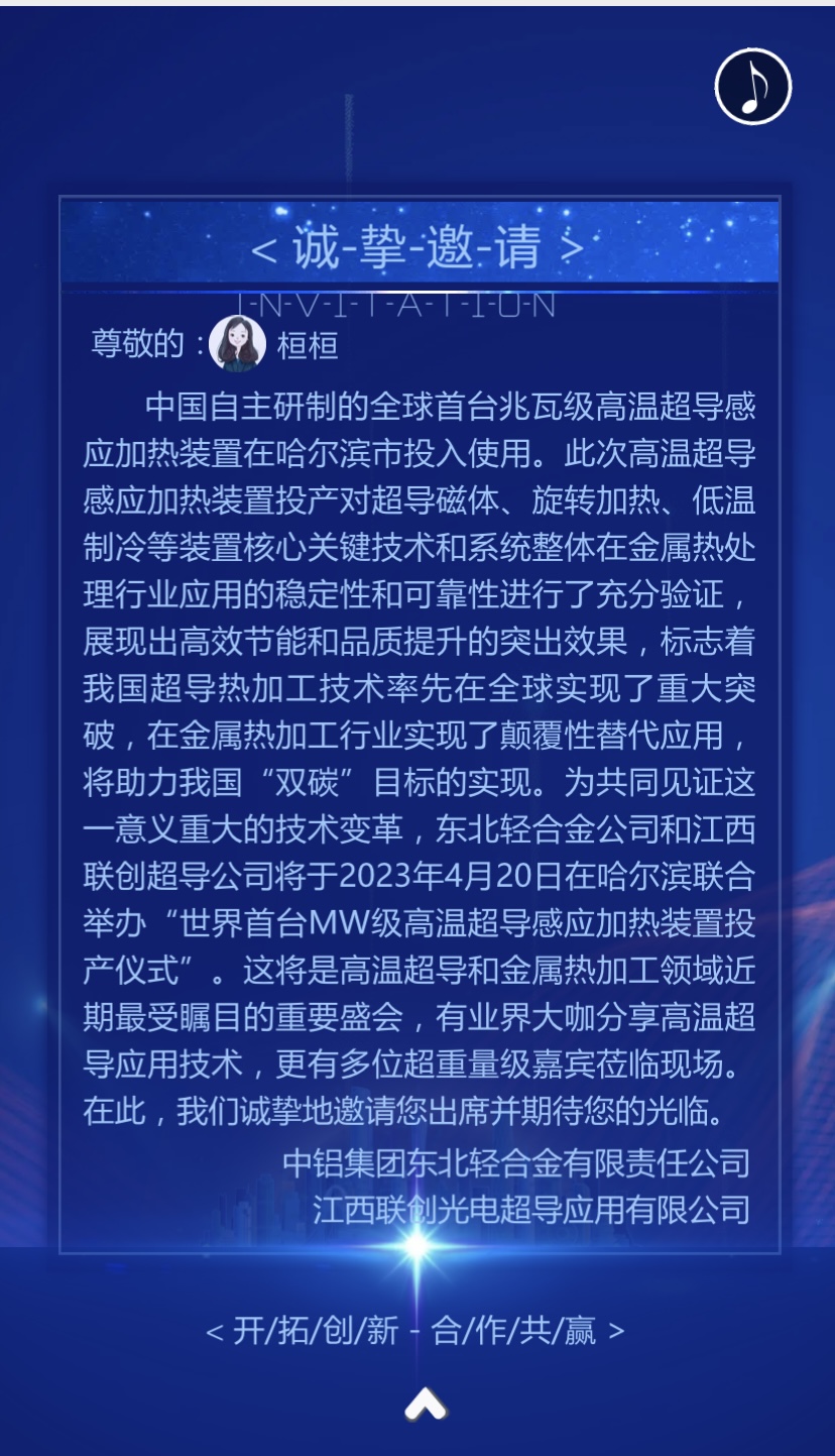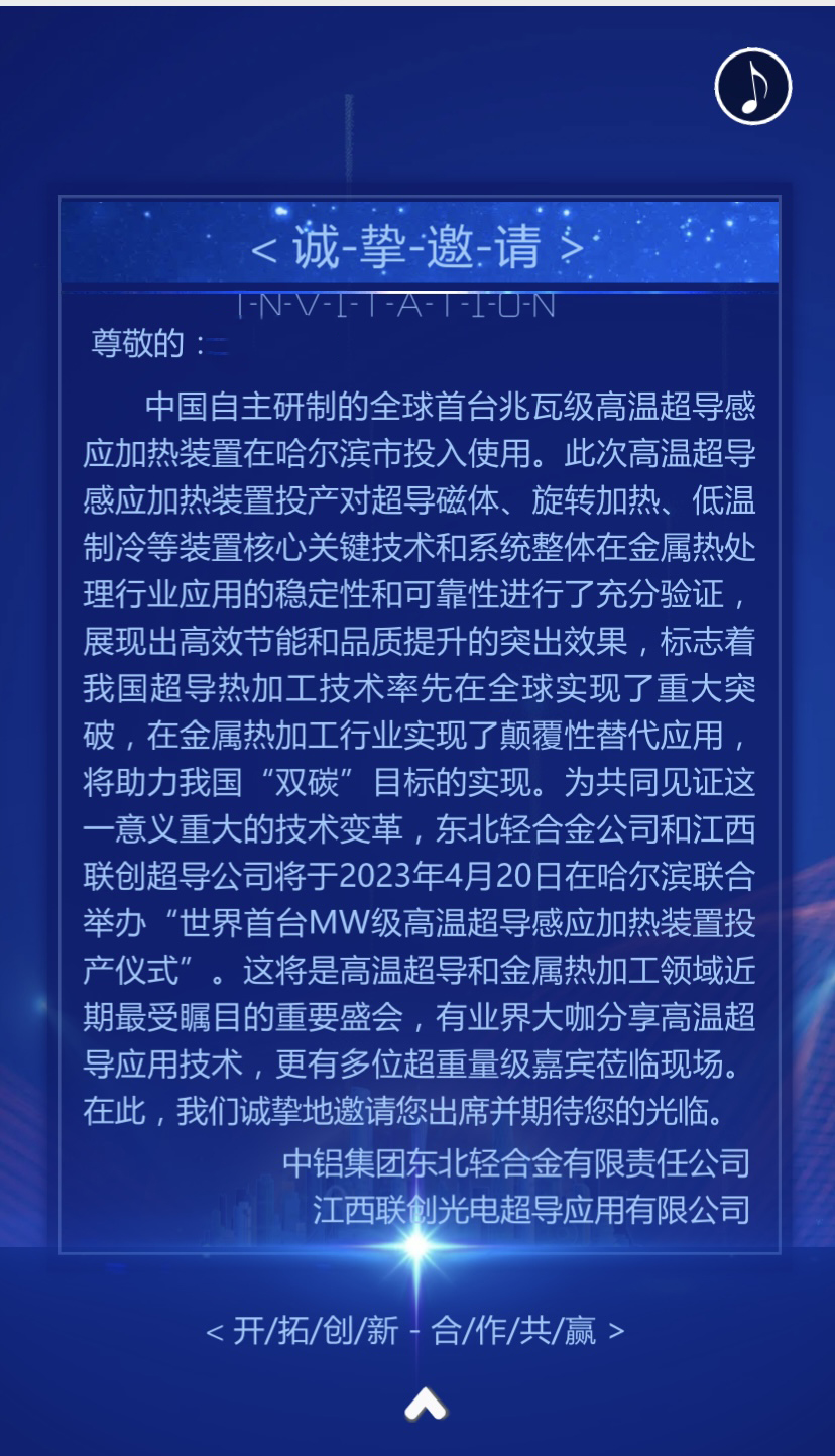 世界首臺MW級高溫超導感應加熱裝置投產(chǎn)儀式邀請函