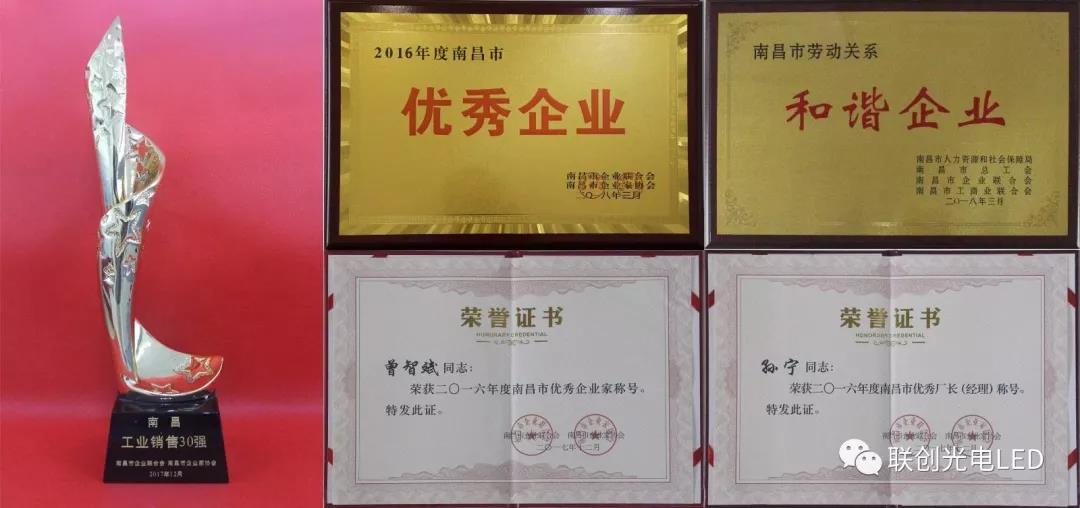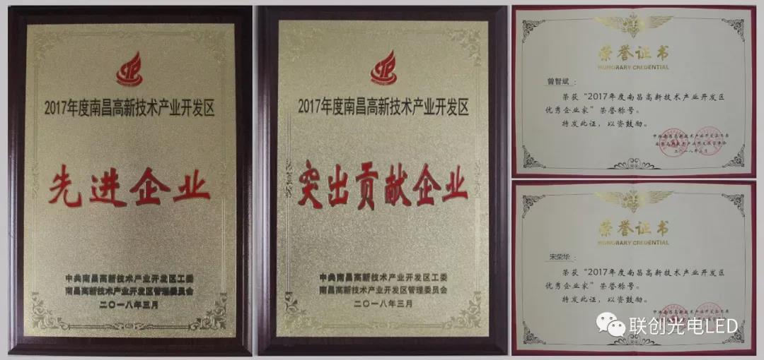 南昌高新區(qū)召開2018年經(jīng)濟(jì)工作暨科技創(chuàng)新大會(huì),聯(lián)創(chuàng)光電被授予“2017年度南昌高新區(qū)先進(jìn)企業(yè)”、“2017年度南昌高新區(qū)突出貢獻(xiàn)企業(yè)”榮譽(yù)稱號(hào),股份公司董事長(zhǎng)曾智斌、總裁助理宋榮華分別榮獲“2017年度南昌高新區(qū)優(yōu)秀企業(yè)家”稱號(hào)。