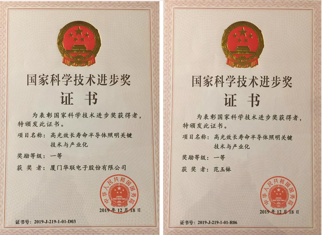 1月10日上午,2019年度國家科學技術獎勵大會在北京人民大會堂隆重舉行,會上共公布國家科學技術進步獎185項。廈門華聯(lián)電子股份有限公司作為第三序列完成單位與中國科學院半導體研究所、三安光電股份有限公司、國家半導體照明工程研發(fā)及產(chǎn)業(yè)聯(lián)盟、廈門光莆電子股份有限公司等多家單位聯(lián)袂參與的“高光效長壽命半導體照明關鍵技術與產(chǎn)業(yè)化”項目榮獲國家科學技術進步獎一等獎,華聯(lián)電子榮譽董事長范玉缽作為獲獎項目主要完成人之一同時接受表彰。